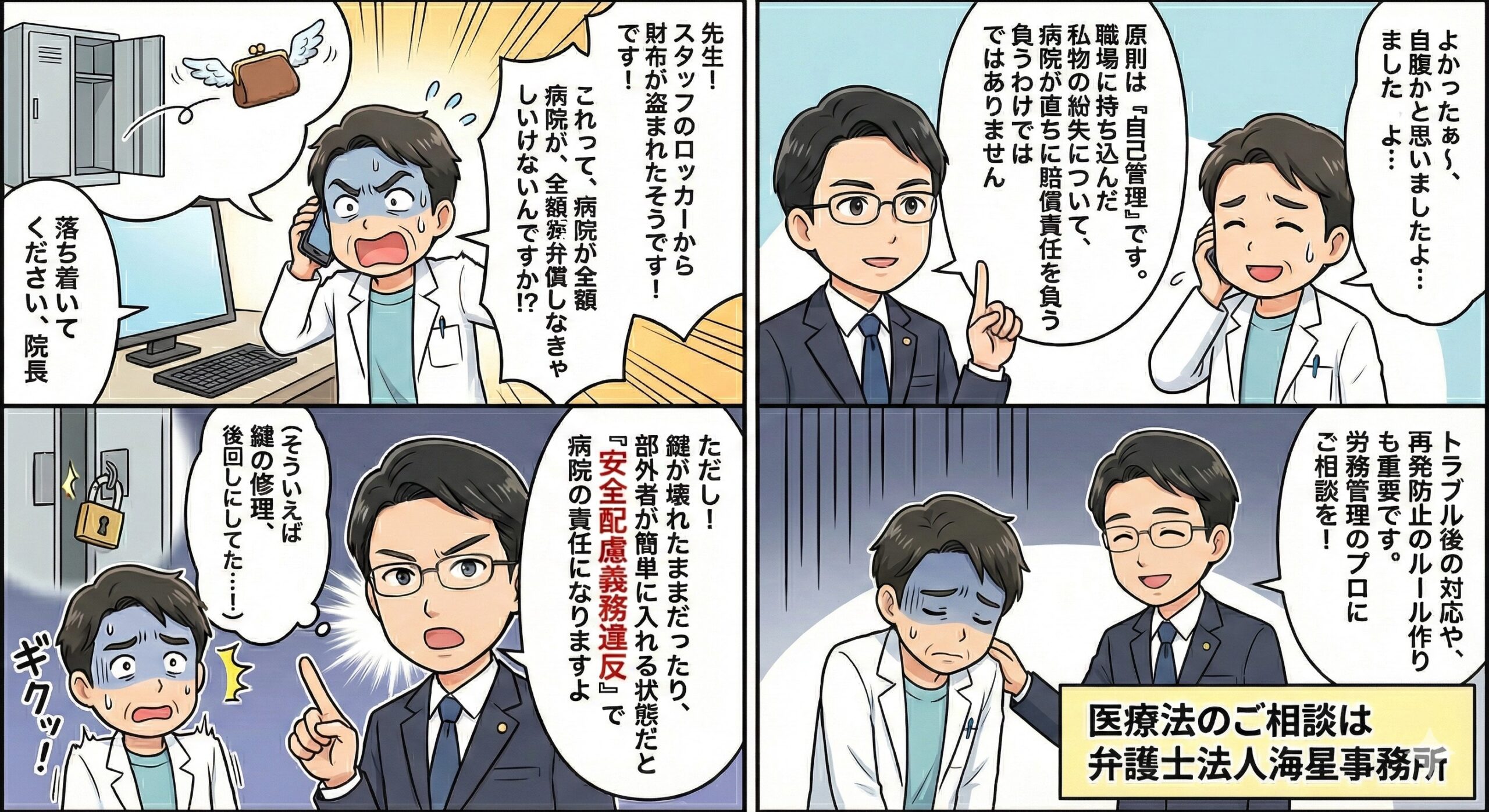 診療所内のスタッフ用の控室のロッカーからあるスタッフの財布が紛失しました。この場合、誰が法的な責任を負うのですか。