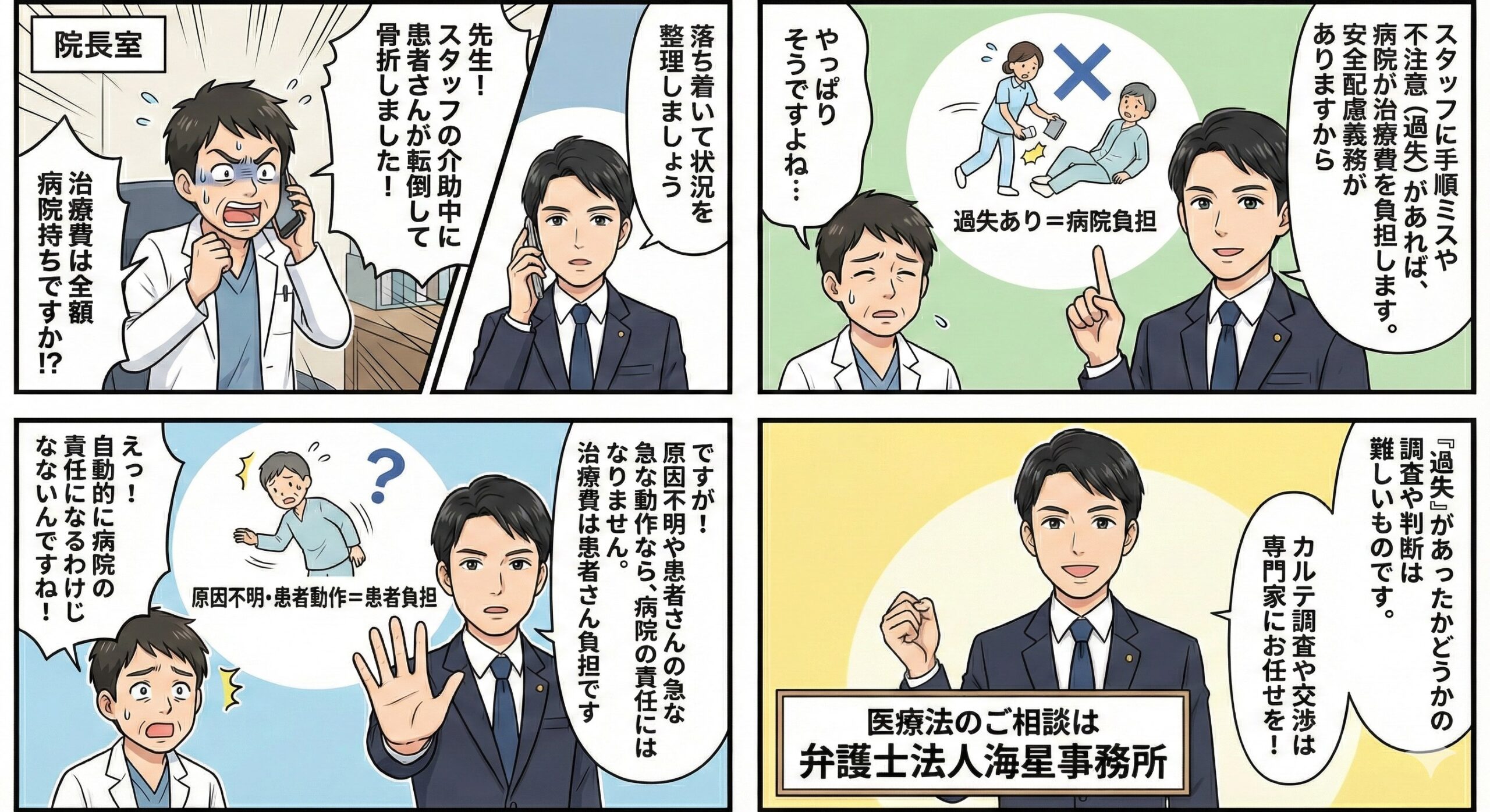 病院内での転倒事故は、「安全配慮義務」の有無という法的な争点に帰着するため、単なる医療費の問題ではなく損害賠償請求へと発展するリスクがあります。