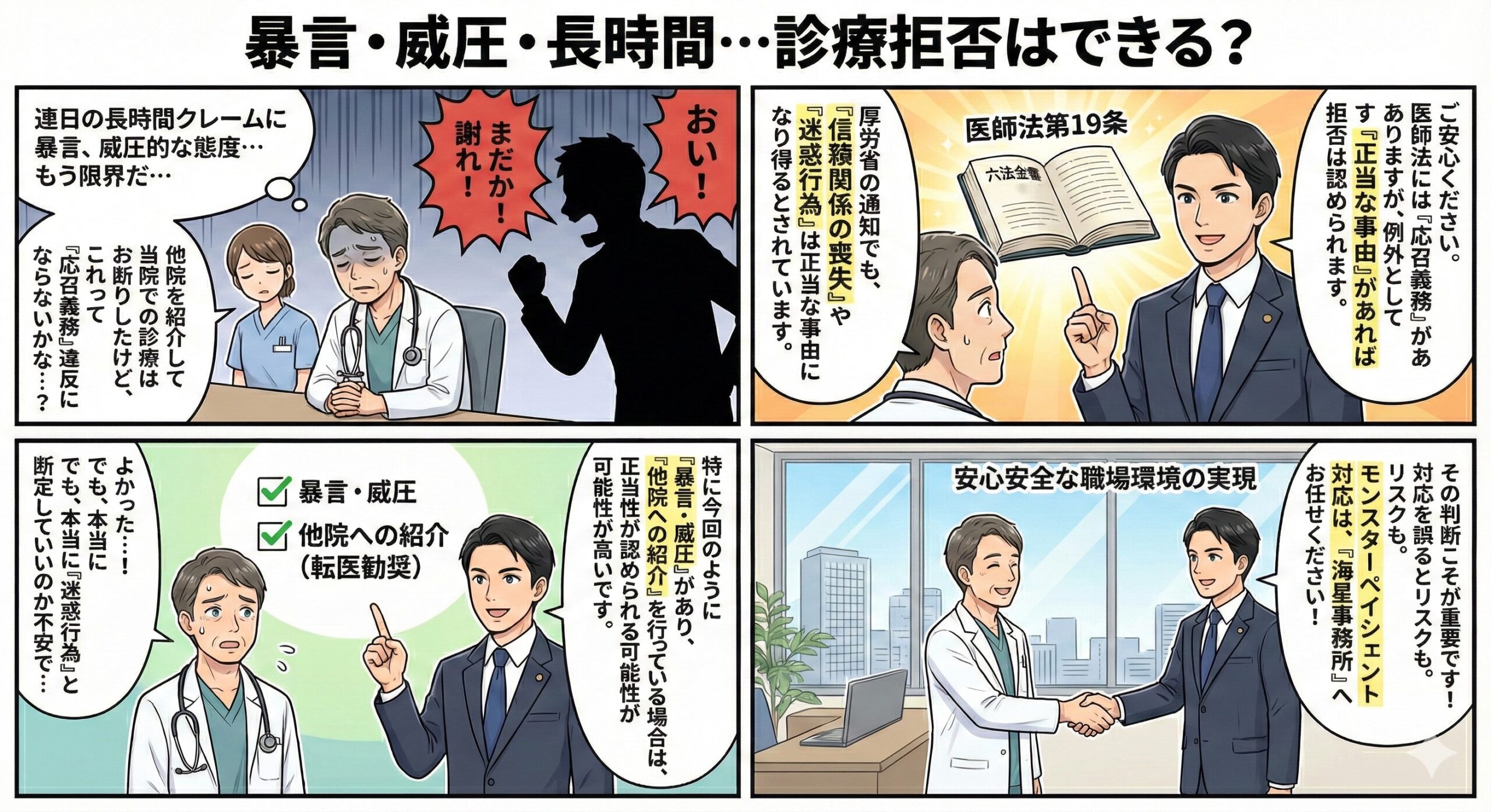 もし、クレームの内容が(たとえ長時間であったとしても)診療上のミスや説明不足に対する正当な疑問や懸念を(患者様の表現方法が拙いながらも)含んでいる場合、それを一方的に「迷惑行為」と断じて診療を拒否すると、応召義務違反を問われるリスクが残ります。