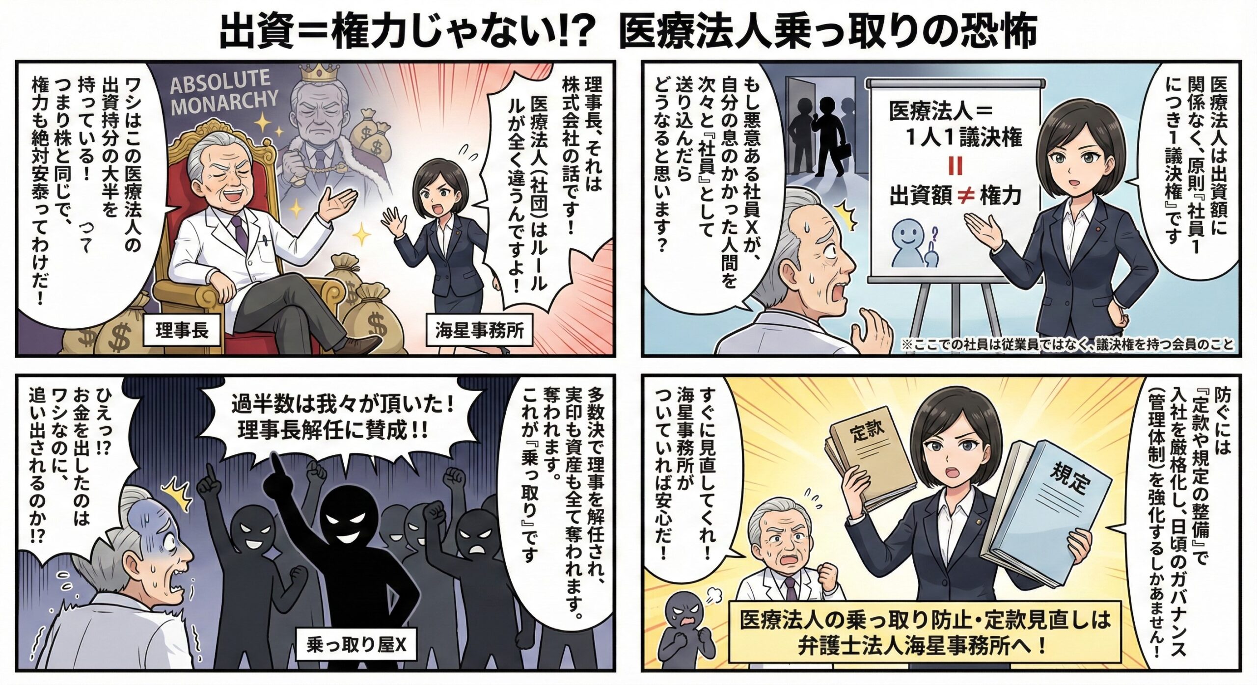 医療法人の社員総会では任期途中の理事を解任することも可能なので、いったん医療法人の乗っ取りが行われるとその後の対応は極めて困難です。