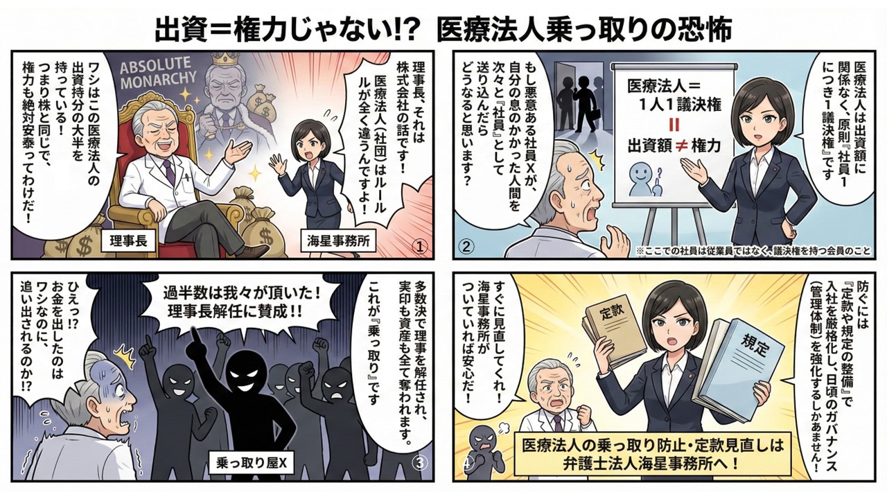 医療法人の社員総会では任期途中の理事を解任することも可能なので、いったん医療法人の乗っ取りが行われるとその後の対応は極めて困難です。