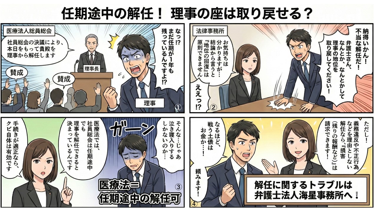 したがって医療法では、社員総会が解任を決議すれば、たとえ任期途中であっても解任の効力自体は原則として発生します。そのため、あなたは理事の地位の継続(復職)を主張し、その地位を回復することは原則としてできません。