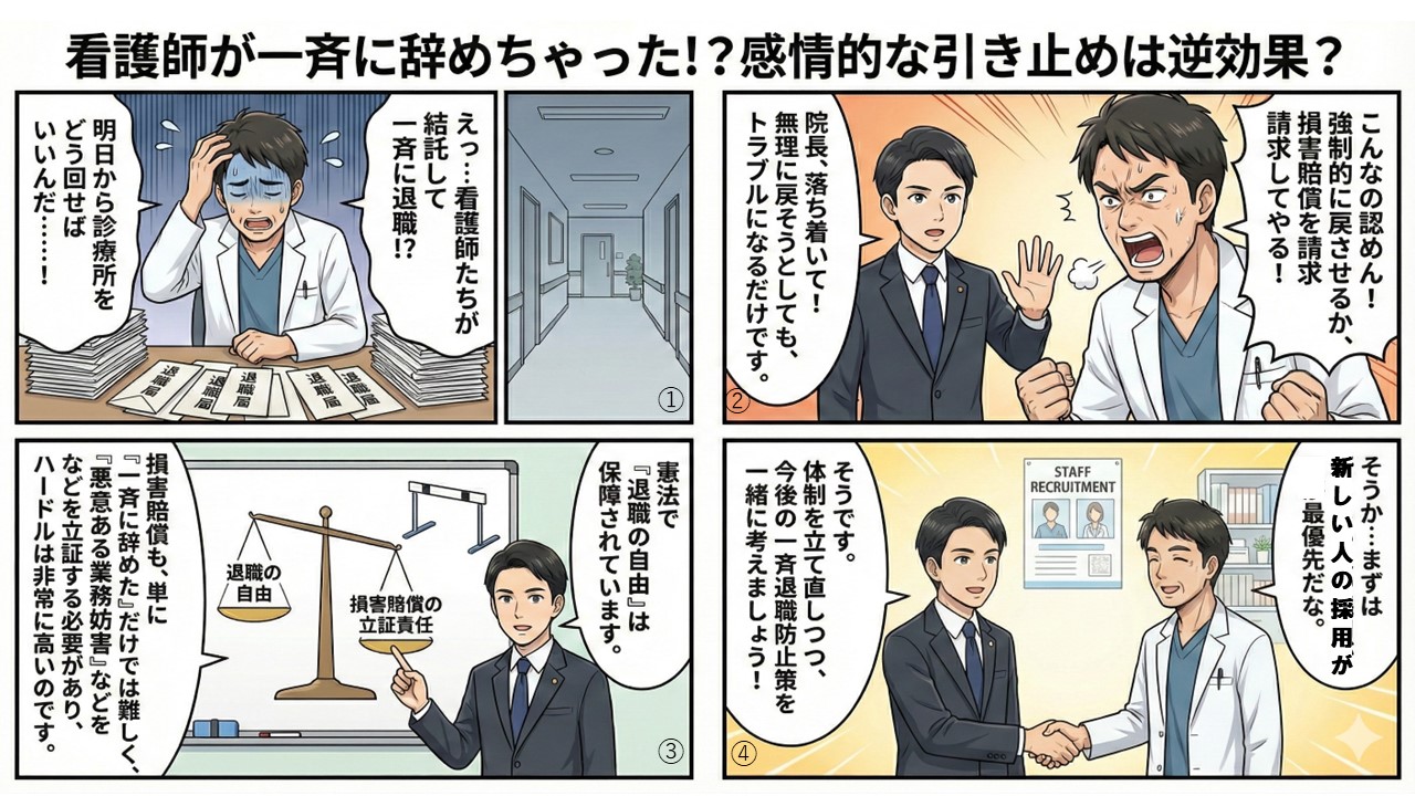 診療所で勤務する看護師が結託して一斉に退職しました。診療所として勤務復帰や損害賠償を求めることはできますか。