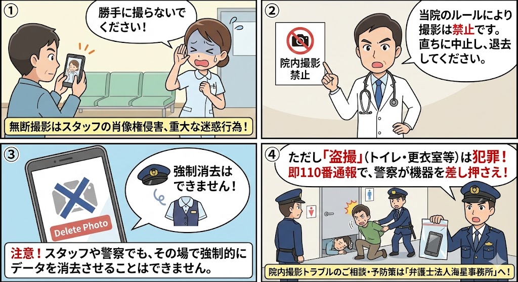 院内での無断撮影は、スタッフの肖像権を侵害するだけでなく、病院の施設管理権を乱す重大な迷惑行為です。毅然とした対応が求められます。