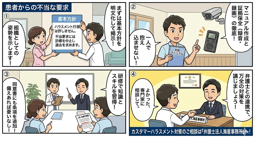 「当院はハラスメントを許さない」という姿勢をホームページや院内掲示で明文化します。また、診療申込書や入院同意書に「不当要求や迷惑行為があった場合は診療を中止し、退去を求める」旨の条項を盛り込んでおくことが、法的な「施設管理権」を行使する際の強い根拠となります。