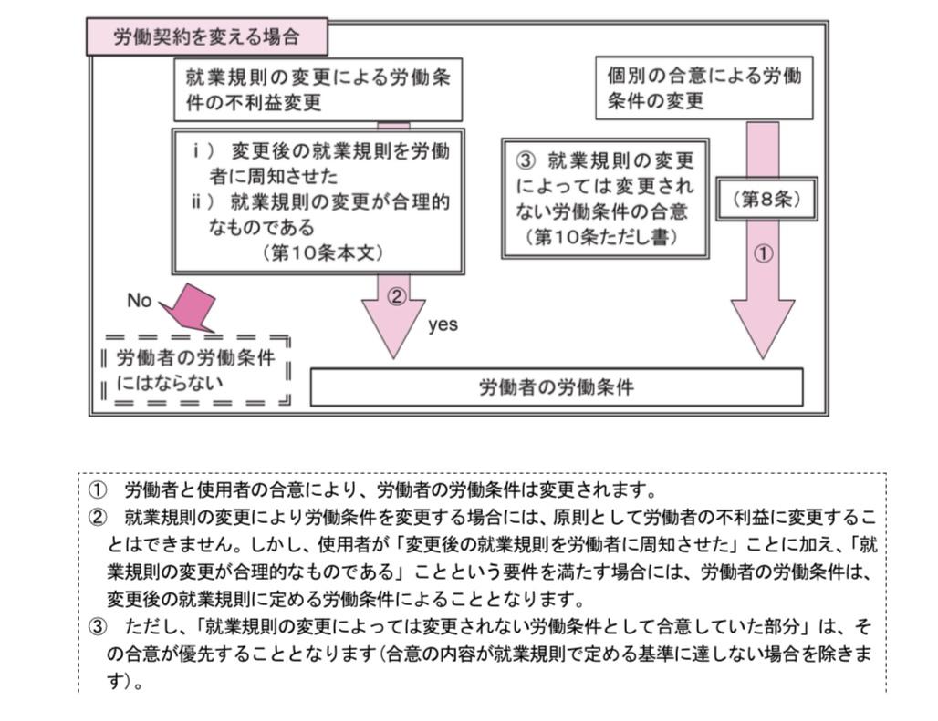 また、就業規則の見直しにより労働条件を変更する場合にも、労働者の合意を得ない限り、一方的に就業規則を変更して、労働者の不利益に労働条件を変更することはできません。(労働契約法第9条)